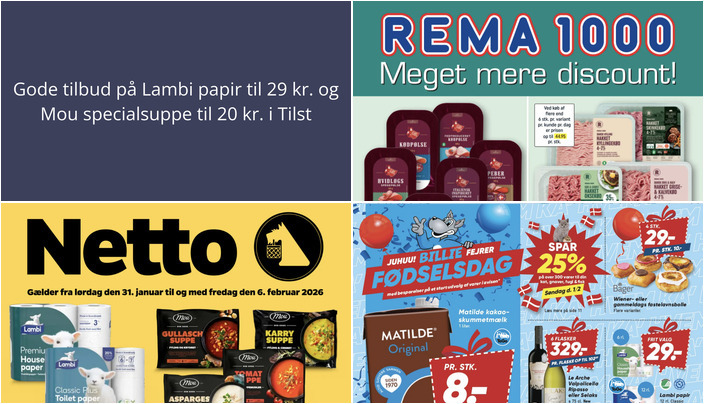 Bilka tilbyder Lambi Classic toiletpapir eller køkkenrulle med 12 ruller til kun 29 kr. Dette tilbud gælder fra fredag den 30. januar til torsdag den 5. februar.