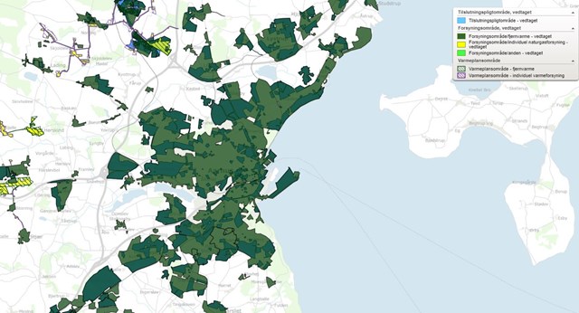 Ligger din bolig inden for det mørkegrønne eller grønt skraverede felt, er der fjernvarme eller planer om det i området, og puljen kan derfor ikke søges. Er boligen derimod i det gule, grønne eller lilla skraverede område, kan puljen søges. Foto: PR.